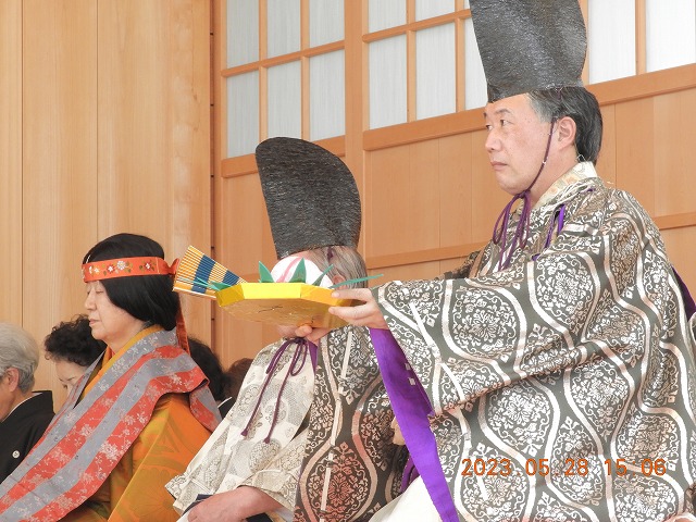 やがて冠をつけ美しく装った西王母が下羽(さがりは)の楽(がく)の音の中、侍女を先立てて現れます。玉盤(ぎょくばん)に不思議の桃の実を載せ帝に捧げると、春風に和しつつ舞い、神も人も花もともに酔い、喜びを尽くして、西王母は天路はるかに昇り去るのです。