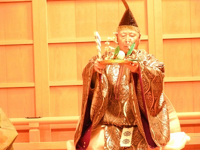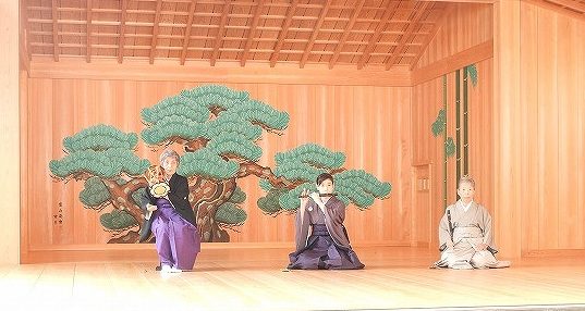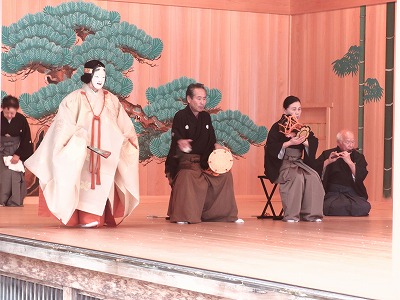 ワキ(帝)とワキヅレ(大臣)が舞台に入り座に着くと、お話が始まります。